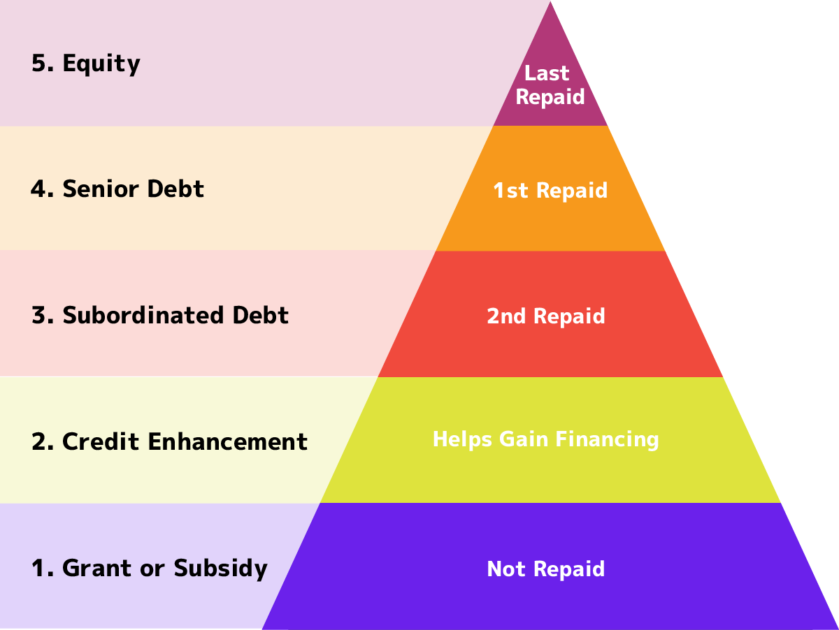 The third layer is Subordinated Debt, which is patient capital. This could be a forgivable loan or another type of funding or financing that can be repaid slowly. Layers of the capital stack near the middle and top have increasingly more risk and may require the investors to be patient to receive their financial returns. Learn more.